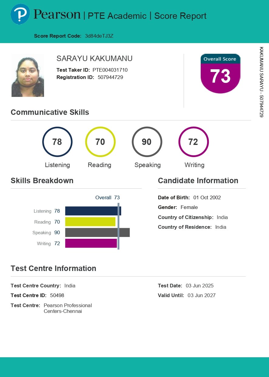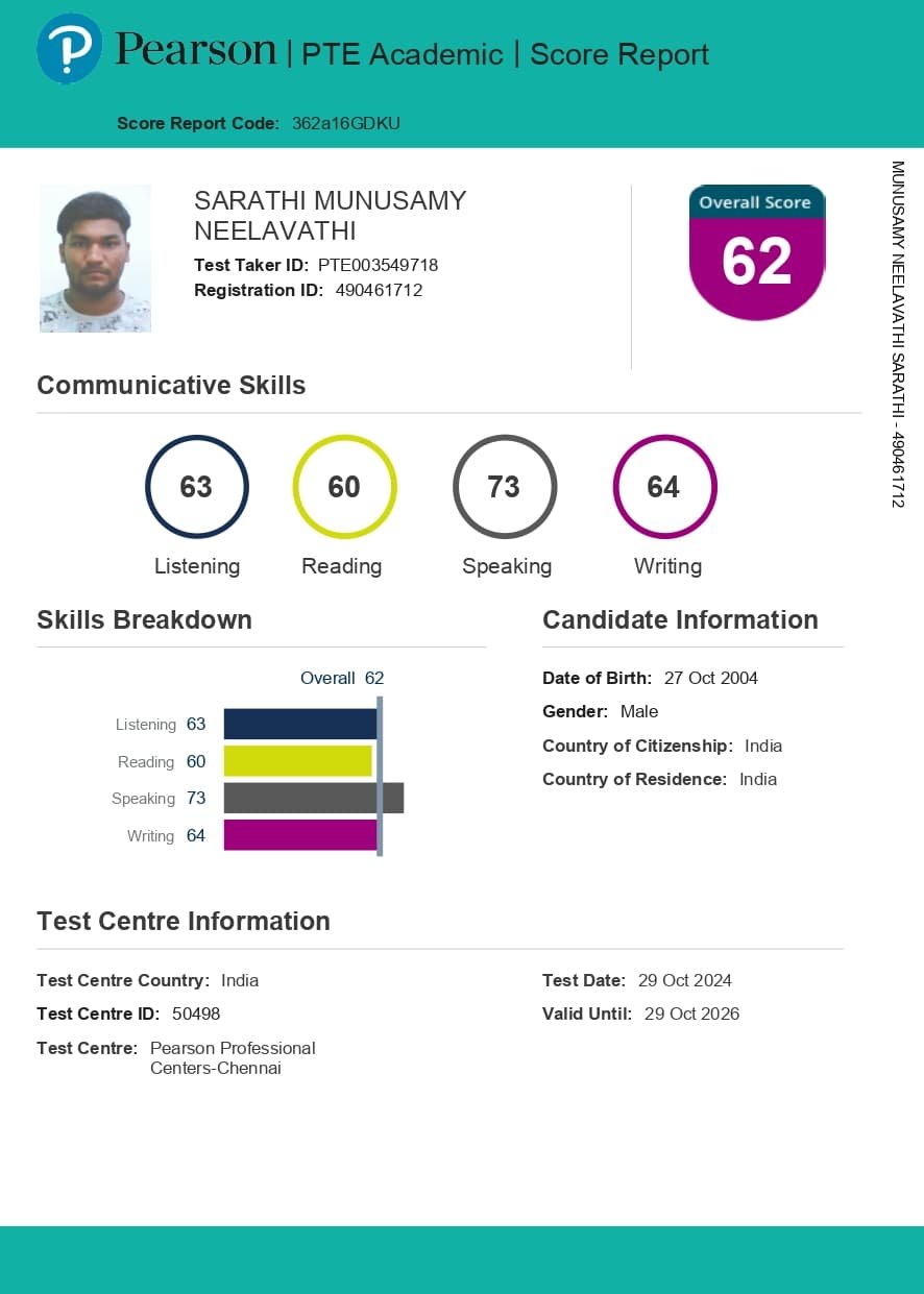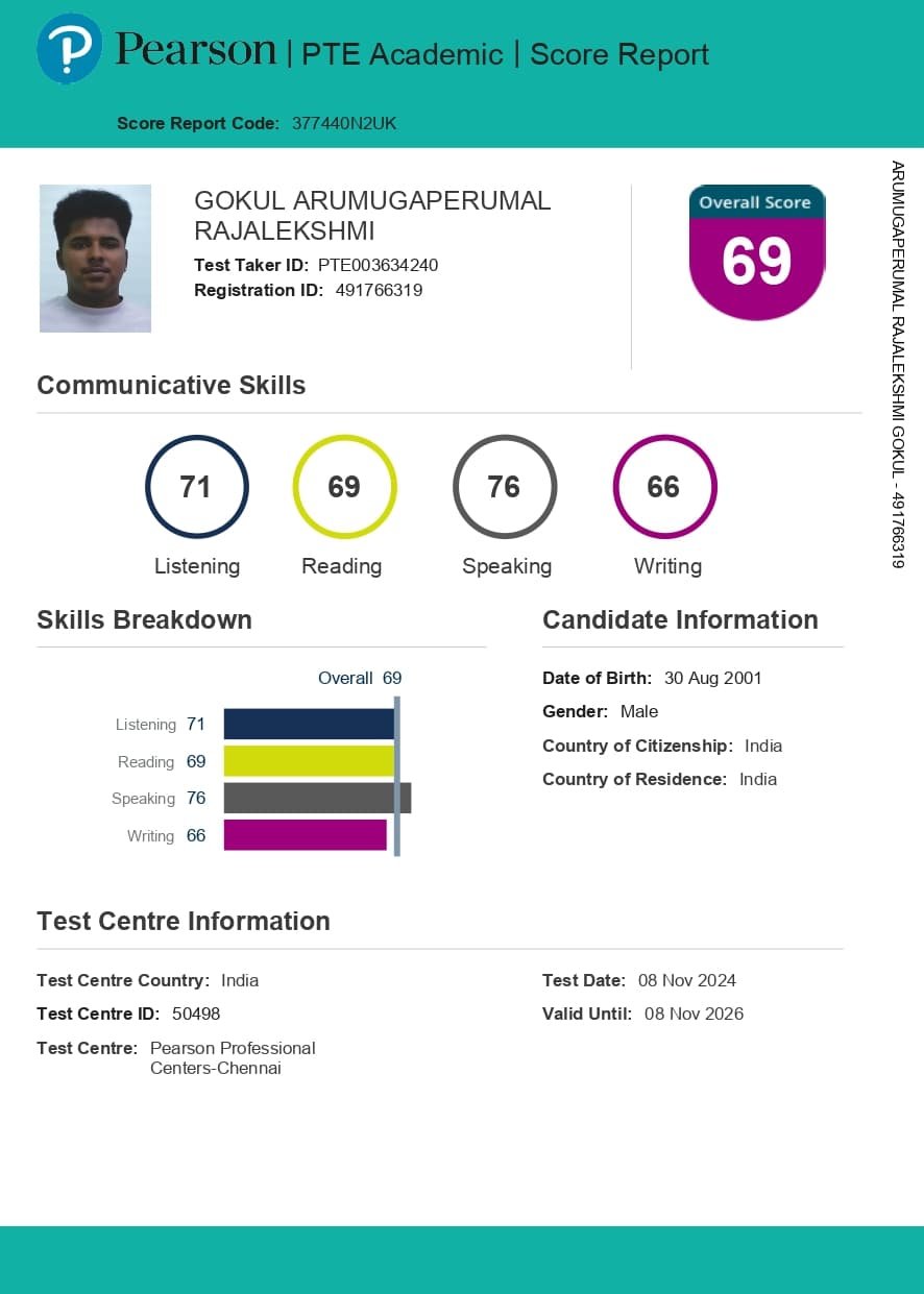 I recently completed my PTE training at RAMYAM Overseas Education, and I can confidently say it was a fantastic experience. The tutors were knowledgeable, supportive, and genuinely committed to helping me succeed. The entire team was friendly, approachable, and professional throughout my learning journey. Special thanks to Aishwarya Mam, Gokul Sir, Kuyil Mam, Ayisha Mam, and Jayanthi Mam for their excellent guidance. The training was tailored to my individual needs, with a strong focus on key areas for improvement. I practiced on the portal and received valuable, constructive feedback that helped me achieve my target score. I’m truly grateful to RAMYAM for helping me take this important step toward my goals.